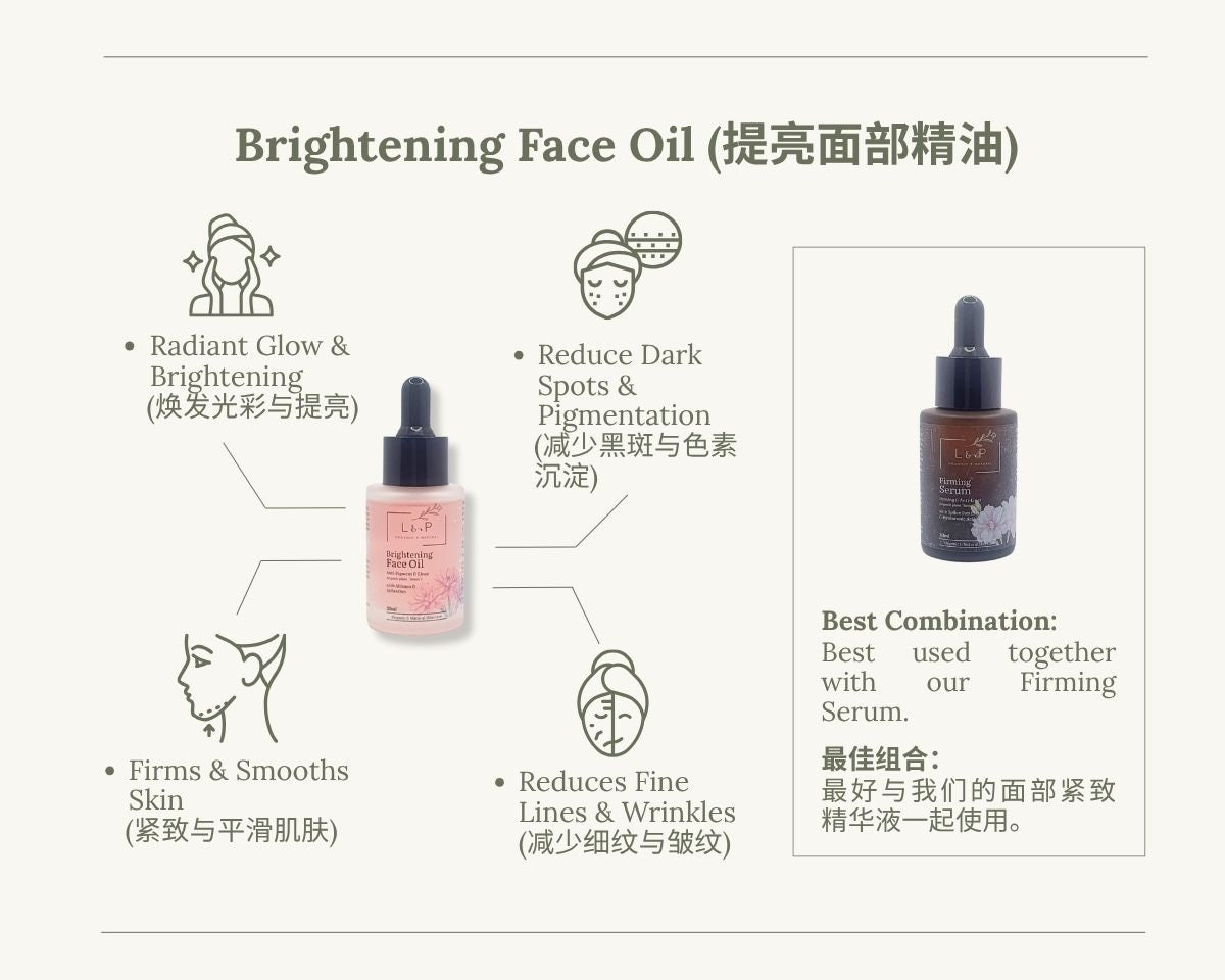 L&P Organic & Natural Brightening Face Oil helps brighten and reduce pigmentation for a more even, glowing complexion.
