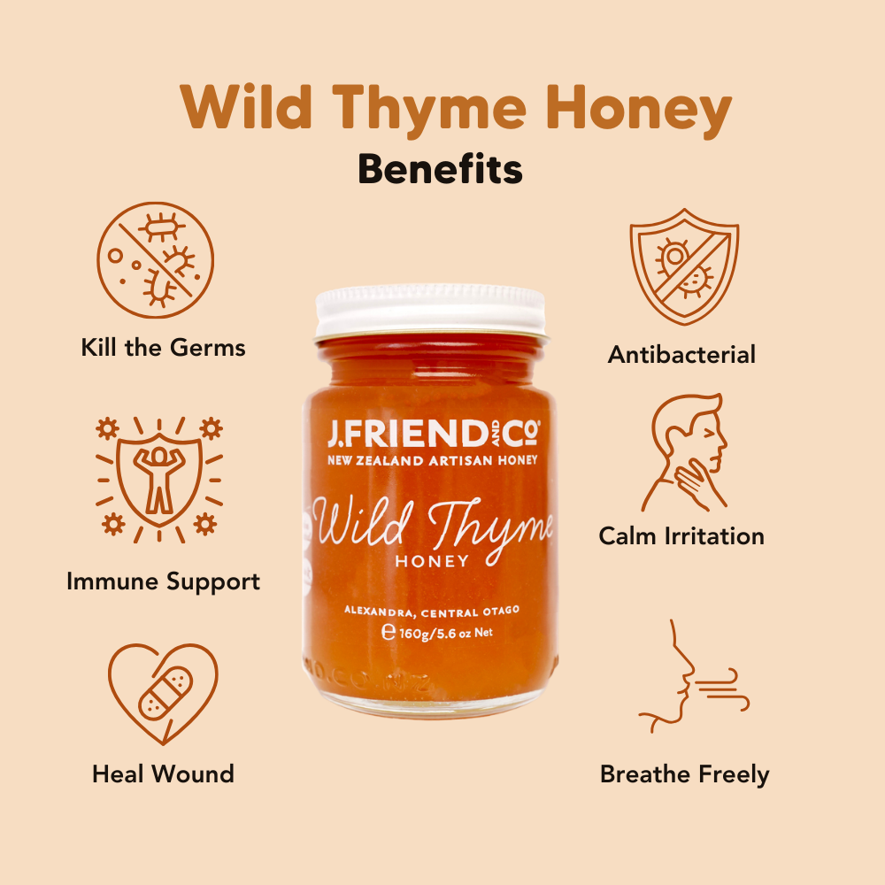 • Wild Thyme Honey 160g – respiratory wellness, high thymol, fast recovery