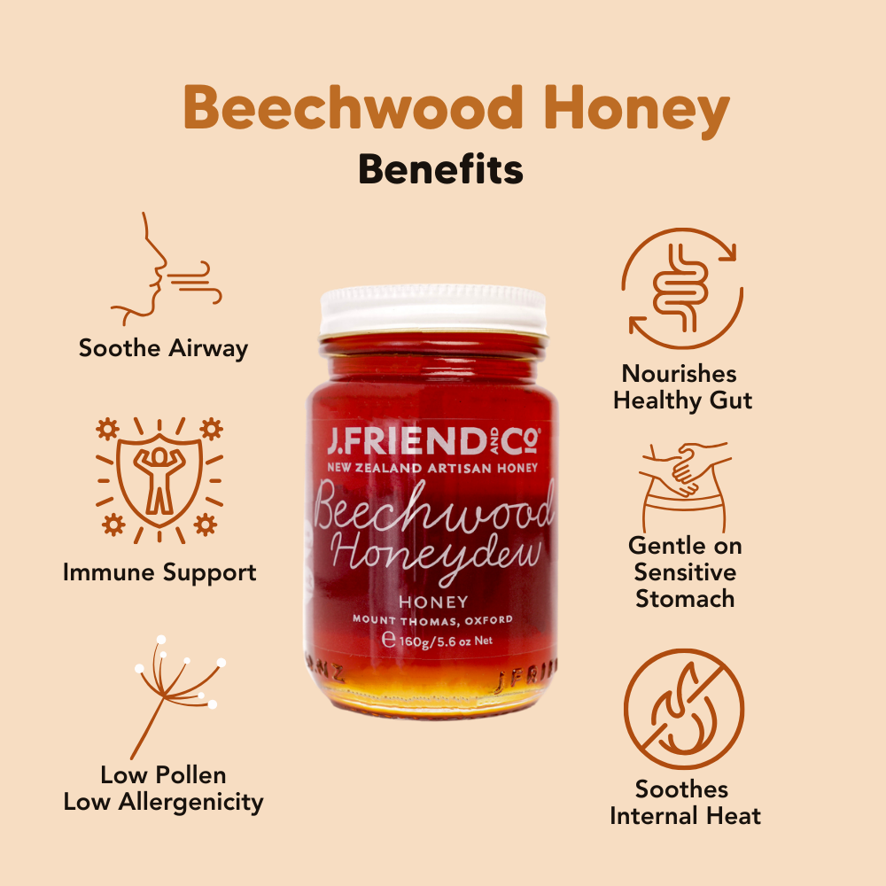 • Beechwood Honeydew Honey 160g – mineral-rich forest honey with deep antioxidant content, support digestion & soothing throat