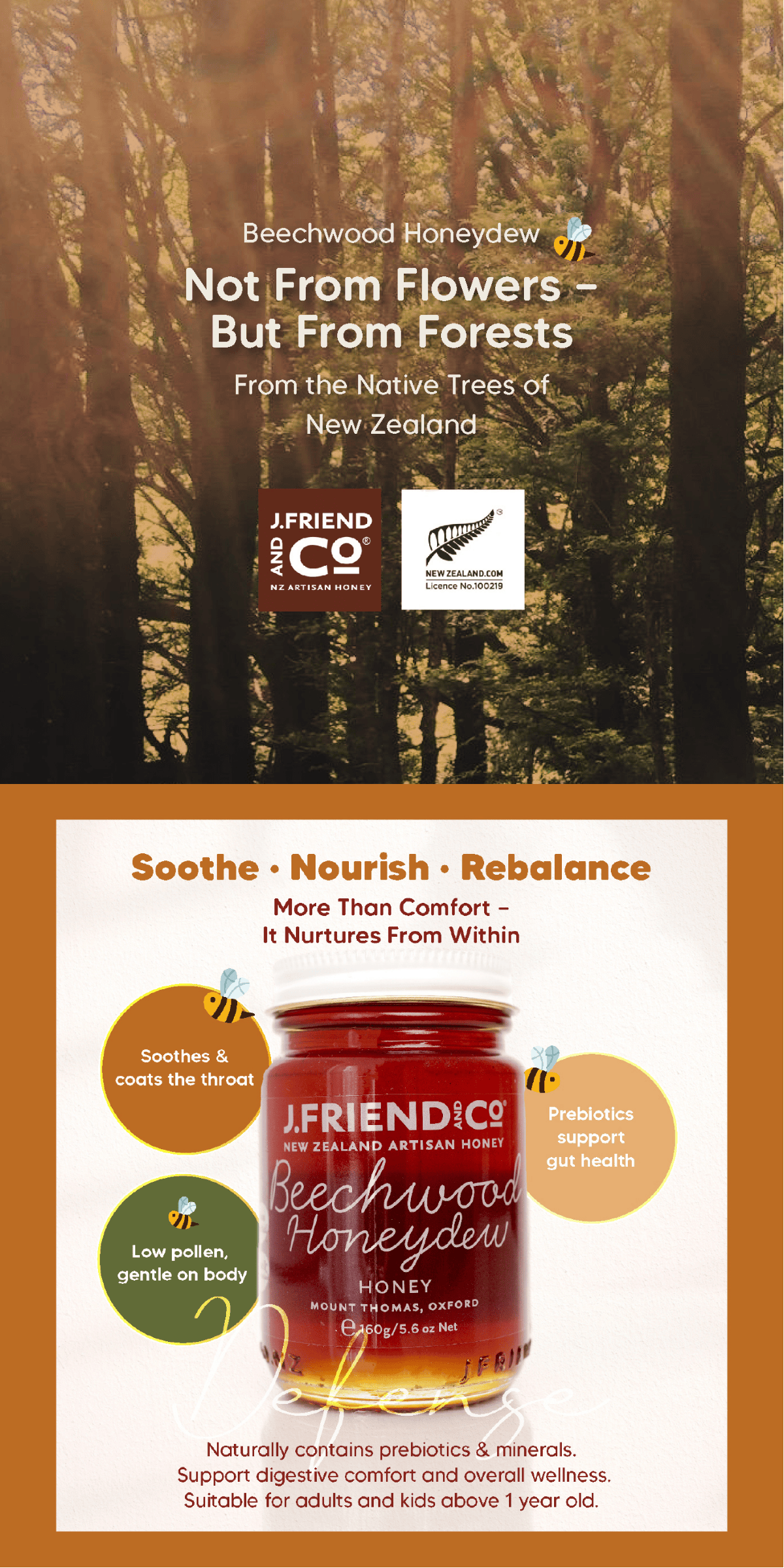 Unlike floral honey, this honeydew honey is derived from tree sap, not nectar, giving it a unique composition. It contains one of the highest antioxidant levels among New Zealand honeys and is especially rich in oligosaccharides – natural prebiotics that help promote and maintain healthy gut flora (probiotic bacteria).